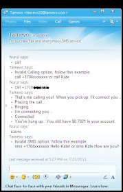 Launch your windows live messenger client and wait for  a friend request from Tamevo. Then you can  start a chat with Tamevo and tell it who you want to call, fax or SMS. Here is an example :